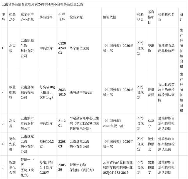 为加强药品质量监管,保障公众用药安全,按照《2024年云南省药品监督抽检工作方案》,我省各级药品监督管理部门对全省药品生产、经营企业和使用单位的药品质量进行了监督抽检,现将药品抽检2024年第4期不合格药品予以公告。
