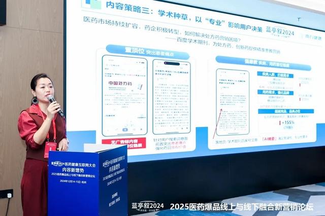 百度渠道中台负责人赵会玲在《内容营销+AI双轮驱动,构建品牌全域增长引擎》的演讲中,结合百度平台特性,深入讲解了内容与营销有机结合并借助AI技术构建医药健康品牌全域增长引擎的方法,展示了新媒体平台在医药品牌发展中的巨大潜力。她详细分析了百度健康在生态、人群、阵地、AI技术以及扶持大健康品类等方面的优势,并列举了如聚集高增速、多场域协同经营、直营电商一站式解决方案等深化用户链接的举措。